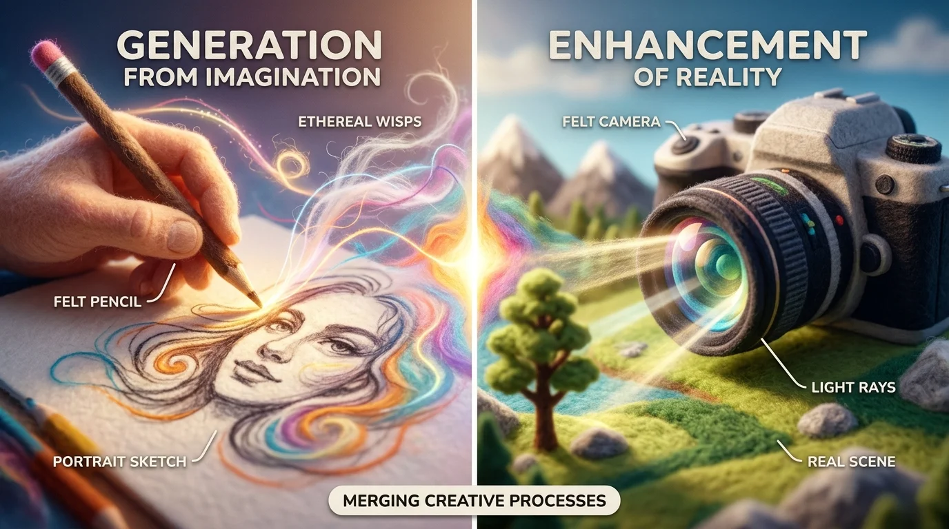 AI images fall into two distinct categories, and understanding the difference matters for how you'll use them. AI-generated images are created entirely from scratch based on text descriptions or visual prompts—a model builds pixels from nothing, following patterns learned from billions of training images. AI-enhanced images, by contrast, start with an existing photograph and use artificial intelligence to modify, improve, or transform it. Both leverage the same underlying technology, but the workflow and outcomes differ significantly.
