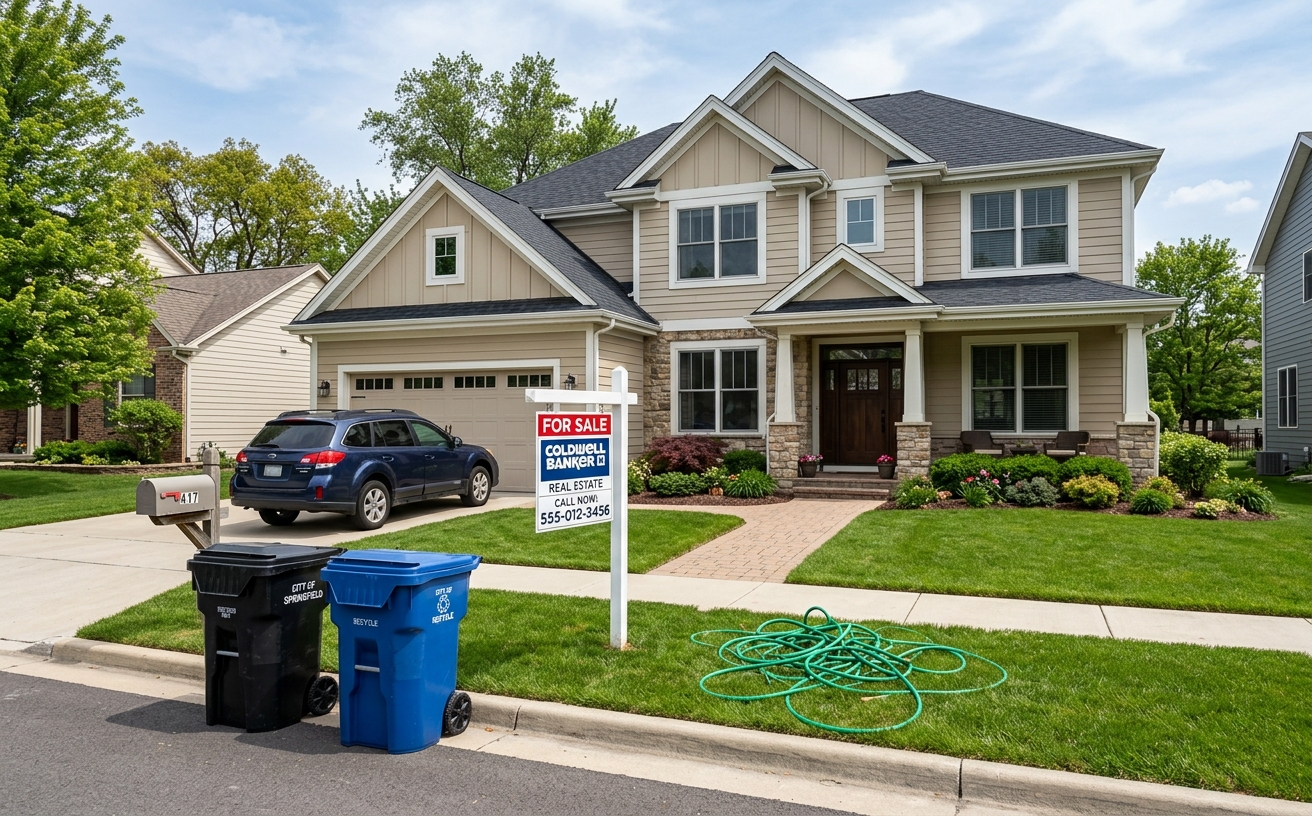 Why this matters beyond aesthetics: Distracting objects shift buyer focus from property features to irrelevant details. Their eyes land on the bright blue recycling bin instead of the custom landscaping or architectural details you want them to notice.