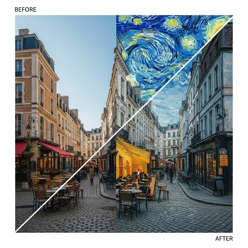 AI style transfer applies artistic characteristics to your photos—Van Gogh's swirls, cinematic color grading, anime aesthetics, vintage film tones. The technology preserves your image content while changing its visual treatment. Change time of day (bright afternoon to moody evening), weather (sunny to rainy), or season (summer to winter) without reshooting.